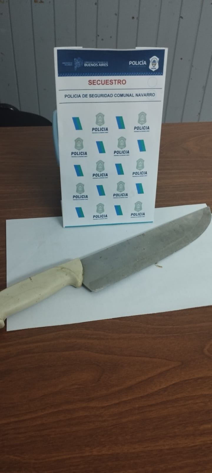 Fecha personal policial raíz llamado 911, en calle 119 Y 12 Navarro, realizo la aprehensión de masculino de (32), con domucilio en nuestro pueblo, quien minutos antes amenazaba de muerta portando una cuchilla de carnicero a su progenitora de (62), masculino este que destrozo vehículo propiedad de su madre. Mantenida comunicación con fiscalía Mercedes dispuso aprehensión y traslado a sede Judicial 1ra. audiencia.