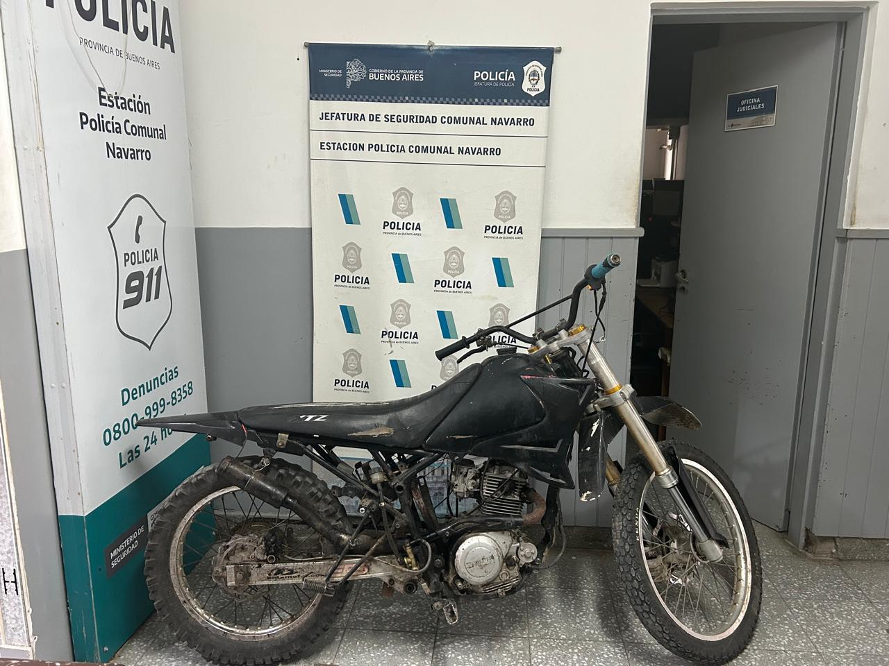 Fecha, personal Policial juntamente con personal de Transito Navarro en calle Circunvalación E/ 40 y 38 de este medio, procede al secuestro de motocicleta marca Yamaha, modelo XTZ, 125 c.c., sin dominio colocado, conducida por menor masculino de (16), por Infracción a la Ley 24.449.Intervención Juzgado de Faltas Navarro.